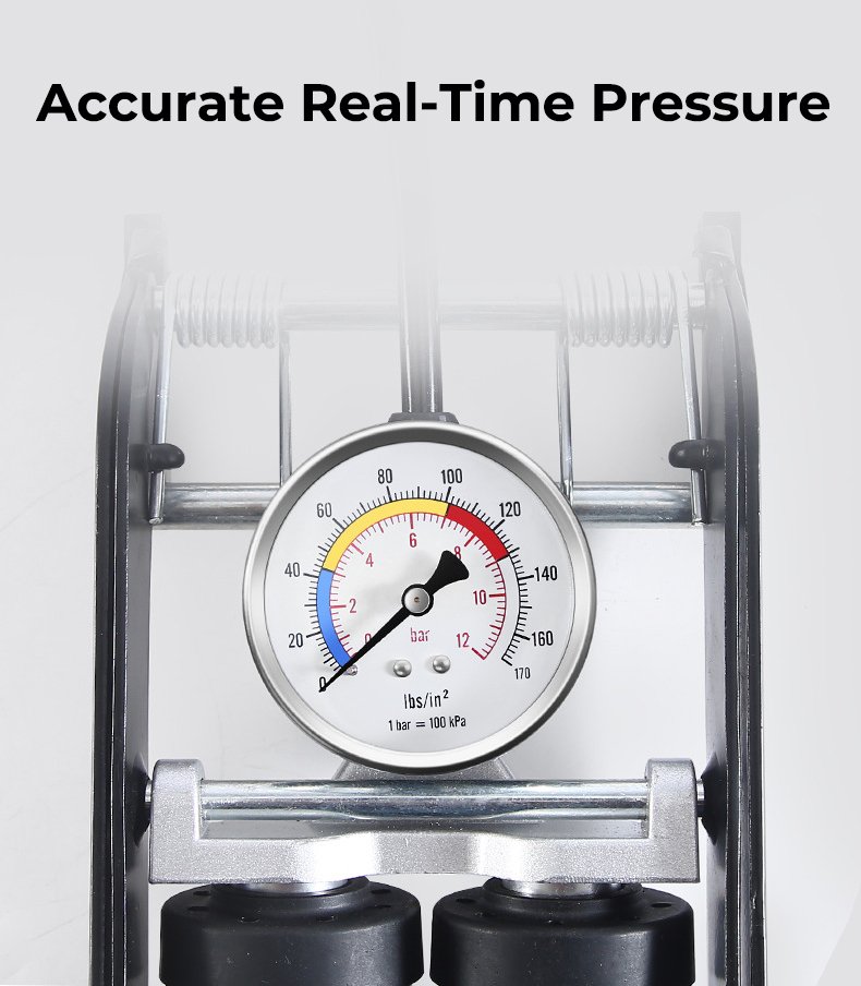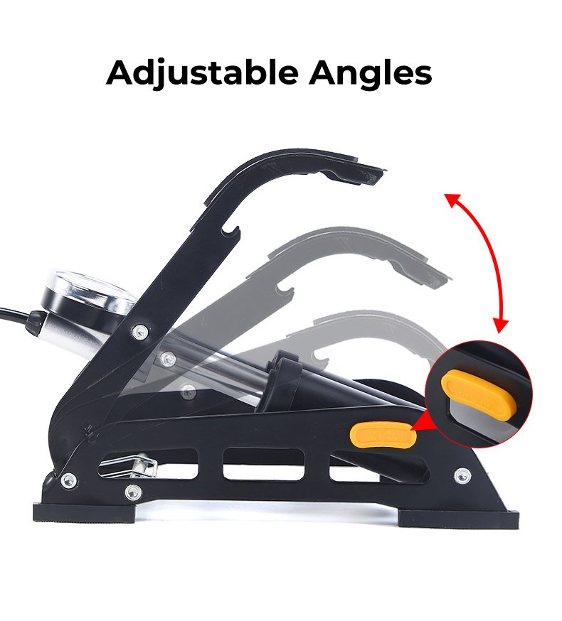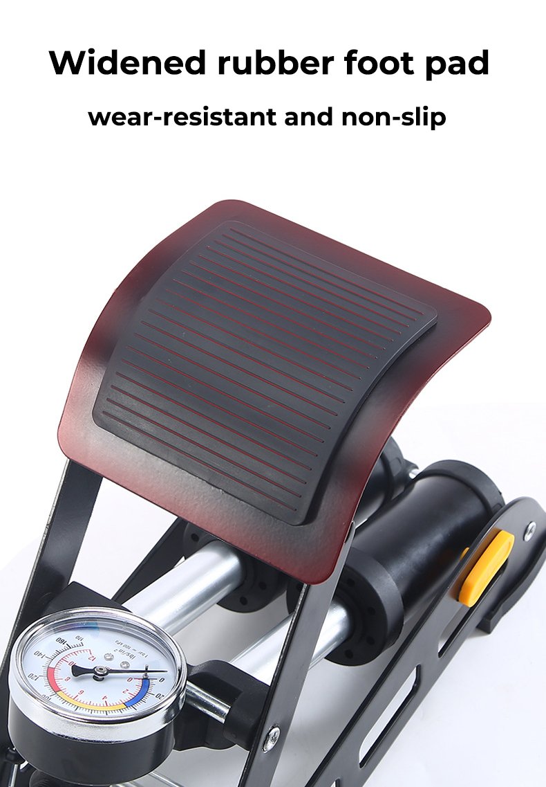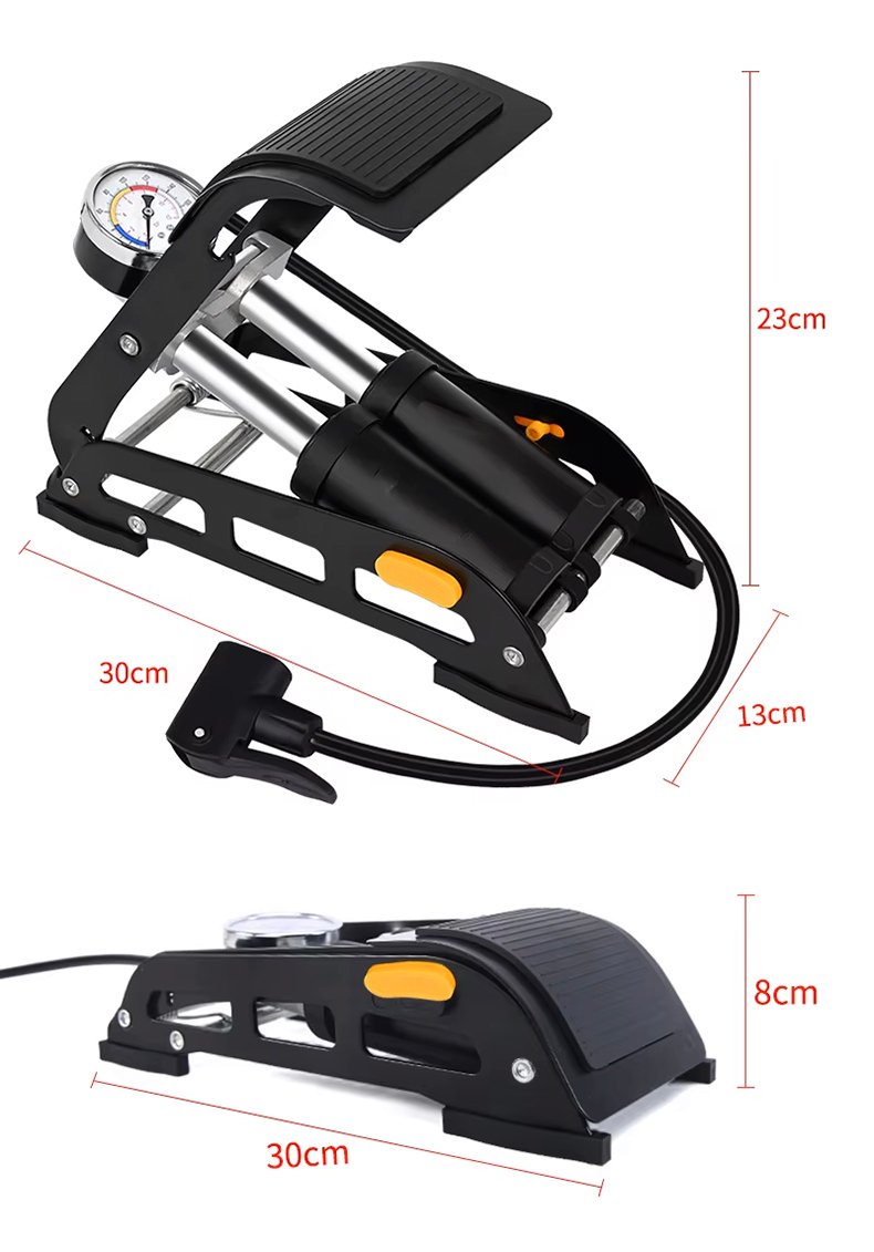High-pressure foot pumps with dual cylinders are robust and efficient tools designed to inflate tires for bicycles, motorcycles, even cars. Featuring two cylinders, these pumps offer increased air volume per stroke, reducing the effort and time needed for inflation. They typically have a durable steel frame, a non-slip foot pedal for stability, and a built-in pressure gauge for precise air pressure monitoring. The dual cylinders are ideal for high-pressure applications, making them versatile for various vehicle types. Many models also come with multiple nozzle adapters for inflating sports equipment and inflatables.