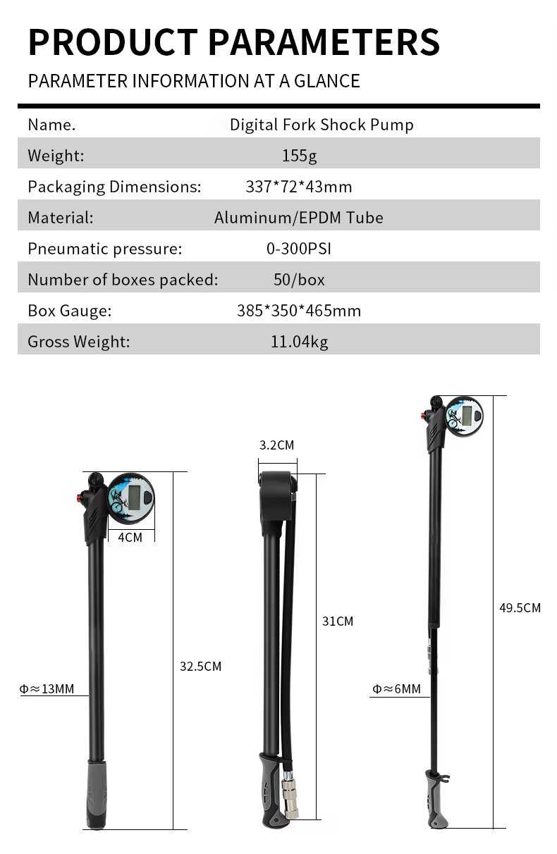 The AR-MP9E digital shock pump is designed for precision and performance. Featuring a clear digital display and a maximum pressure of 300 PSI, this high-quality pump is perfect for tuning MTB suspension systems with ease and accuracy. Ideal for riders and mechanics alike, the AR-MP9E ensures reliable air pressure adjustments every time.